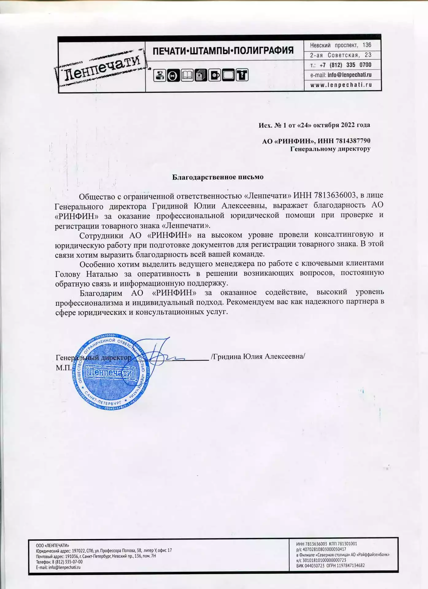 Общество с ограниченной ответственностью «Ленпечати» ИНН 7813636003, в лице Генерального директора Гридиной Юлии Алексеевны, выражает благодарность АО «РИНФИН» за оказание профессиональной юридической помощи при проверке и регистрации товарного знака «Ленпечати».