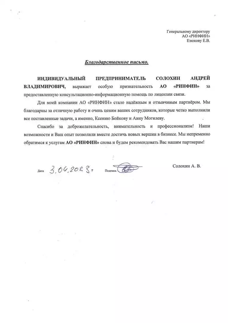 ИНДИВИДУАЛЬНЫЙ ПРЕДПРИНИМАТЕЛЬ СОЛОХИН АНДРЕЙ ВЛАДИМИРОВИЧ, выражает особую признательность АО «РИНФИН» за предоставленную консультационно-информационную помощь по лицензии связи.