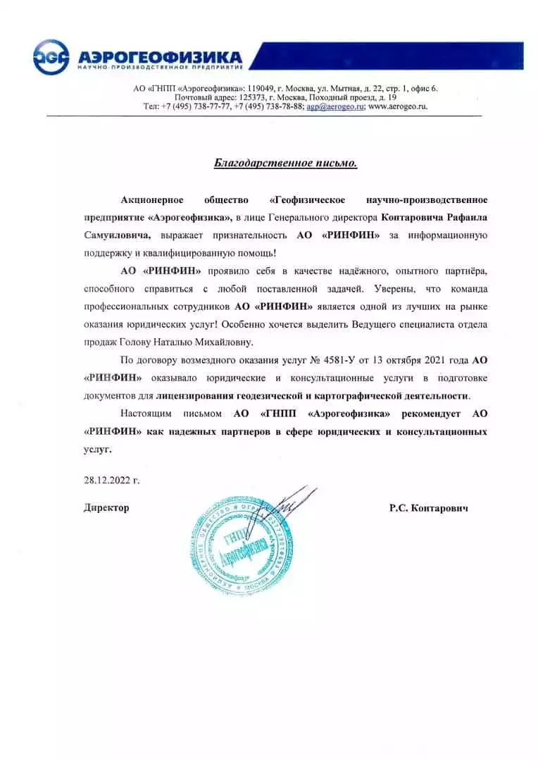 Настоящим письмом АО "ГНПП "Аэрогеофизика" рекомендует АО "РИНФИН" как надёжных партнёров в сфере юридических и консультационных услуг.