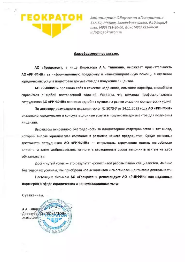 АО «Геократон», в лице Генерального директора А.А. Типикина, выражает признательность АО «РИНФИН» за информационную поддержку и квалифицированную помощь в оказании юридических услуг в подготовке документов для получения лицензии.