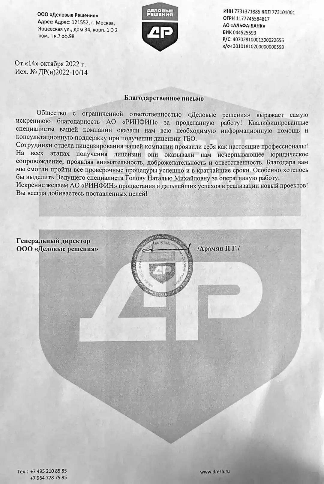 Общество с ограниченной ответственностью "Деловые решения" выражают самую искрению благодарность АО "РИНФИН" за проделанную работу! Квалифицированные специалисты вашей компании оказали нам всю необходимую информационную помощь и консультационную поддержку при получении лицензии ТБО.