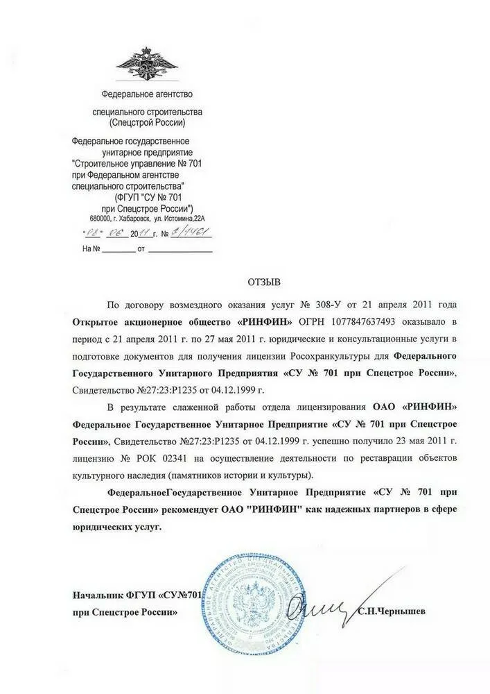 По договору возмездного оказания услуг № 308-У от 21 апреля 2011 года Открытое акционерное общество «РИНФИН» ОГРН 1077847637493 оказывало в период с 21 апреля 2011 г. по 27 мая 2011 г. юридические и консультационные услуги в подготовке документов для получения лицензии Росохранкультуры для Федерального Государственного Унитарного Предприятия «СУ № 701 при Спецстрое России», Свидетельство № 27:23:Р1235 от 04.12.1999 г.