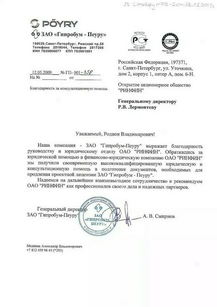 Наша компания — ЗАО «Гипробум-Пеуру» выражает благодарность руководству и юридическому отделу АО «РИНФИН». Обратившись за юридической помощью в финансово-юридическую компанию АО «РИНФИН» мы получили своевременную высококвалифицированную юридическую и консультационную помощь в подготовке документов, необходимых для продления проектной лицензии ЗАО «Гипробум-Пеуру».