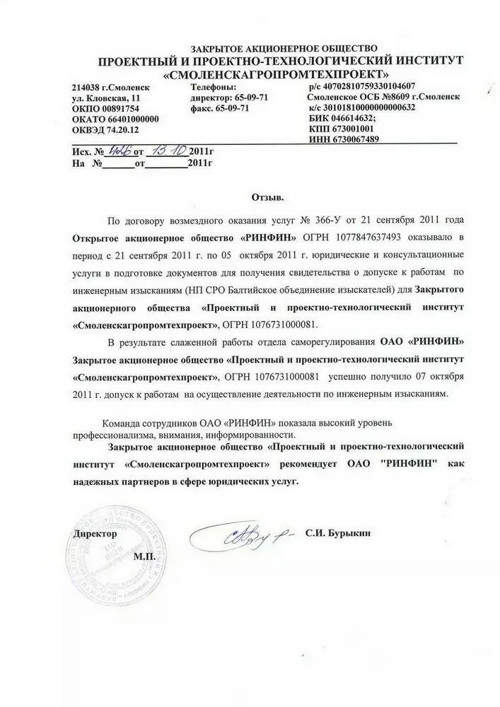 По договору возмездного оказания услуг № 366-У от 21 сентября 2011 года Открытое акционерное общество «РИНФИН» ОГРН 1077847637493 оказывало в период с 21 сентября 2011 г. по 05 октября 2011 г. юридические и консультационные услуги в подготовке документов для получения свидетельства о допуске к работам по инженерным изысканиям (НП СРО Балтийское объединение изыскателей) для Закрытого акционерного общества «Проектный и проектно-технологический институт «Смоленскагропромтехпроект», ОГРН 1076731000081.