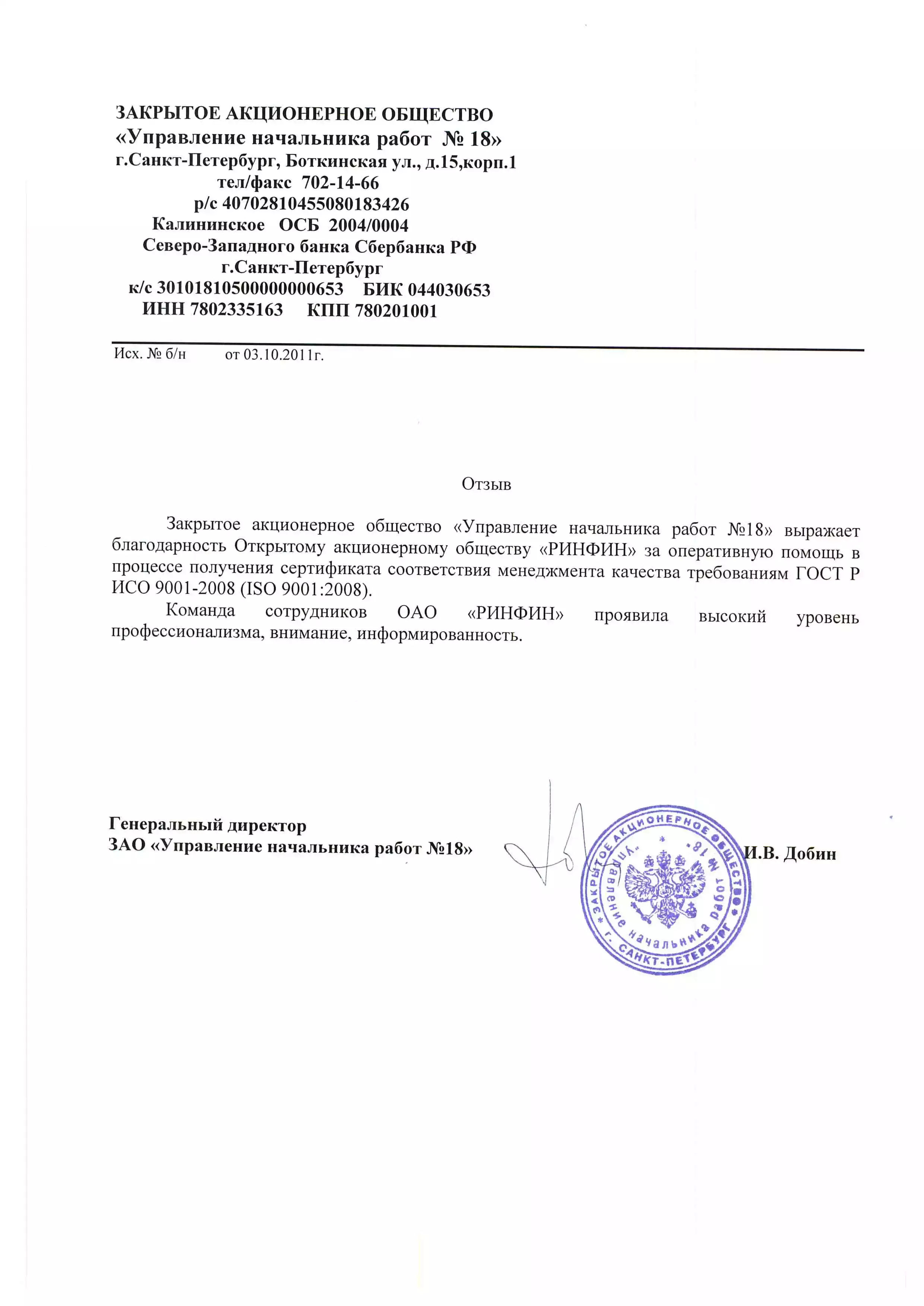 Закрытое акционерное общество «Управление начальника работ № 18» выражает благодарность Открытому акционерному обществу «РИНФИН» за оперативную помощь в процессе получения сертификата соответствия менеджмента качества требованиям ГОСТ Р ИСО 9001-2008 (ISO 9001:2008).