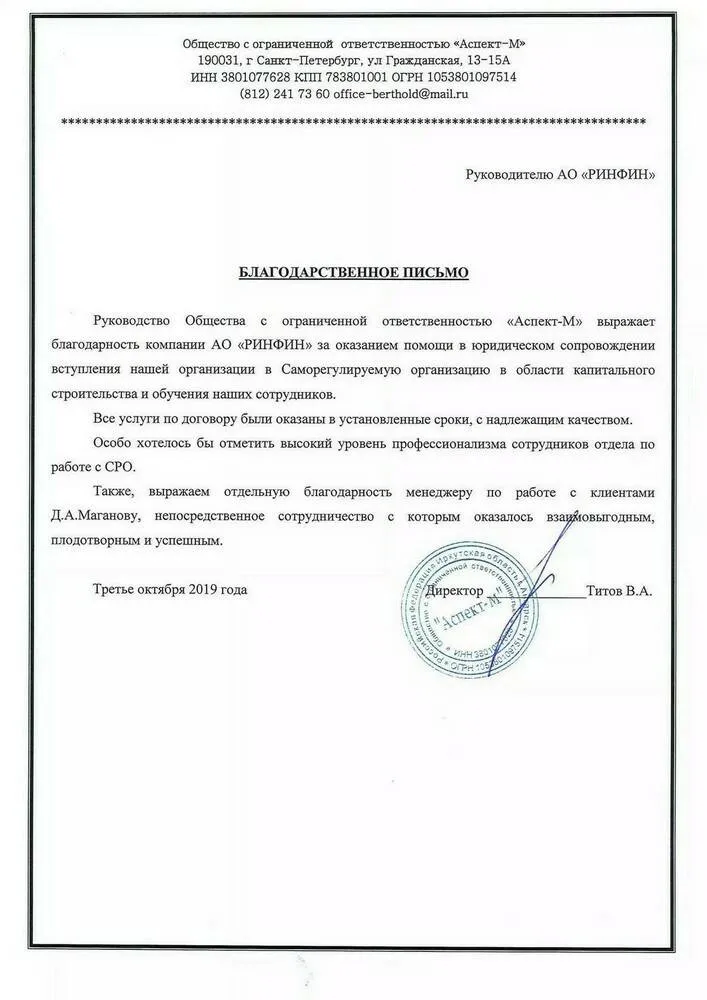 Руководство Общества с ограниченной ответственностью «Аспект-М» выражает благодарность компании АО «РИНФИН» за оказанием помощи в юридическом сопровождении вступления нашей организации в Саморегулируемую организацию в области капитального строительства и обучения наших сотрудников.