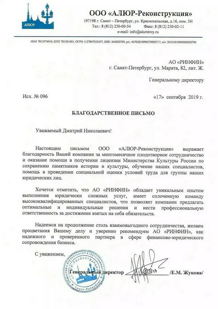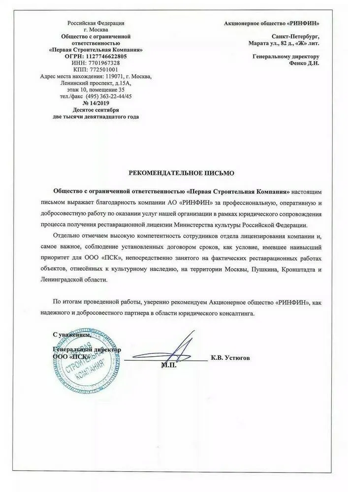 Общество с ограниченной ответственностью «Первая Строительная Компания» настоящим письмом выражает благодарность компании АО «РИНФИН» за профессиональную, оперативную и добросовестную работу по оказании услуг нашей организации в рамках юридического сопровождения процесса получения реставрационной лицензии Министерства культуры Российской Федерации.