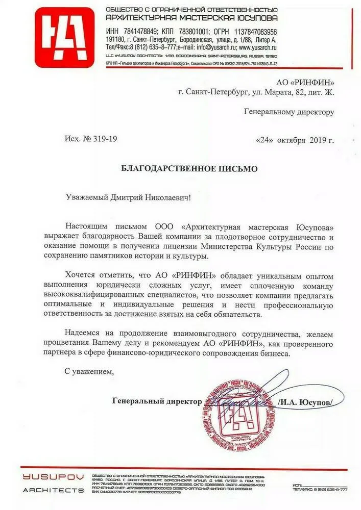 Уважаемый Дмитрий Николаевич! Настоящим письмом ООО «Архитектурная мастерская Юсупова» выражает благодарность Вашей компании за плодотворное сотрудничество и оказание помощи в получении лицензии Министерства Культуры России по сохранению памятников истории и культуры.