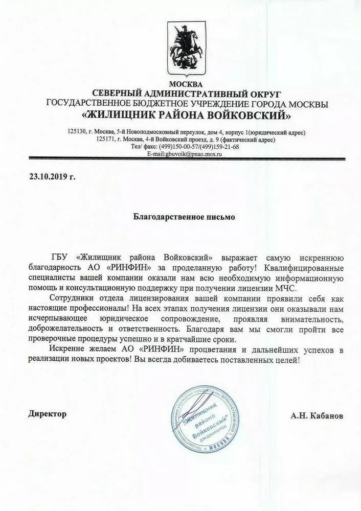 ГБУ «Жилищник района Войковский» выражает самую искреннюю благодарность АО «РИНФИН» за проделанную работу! Квалифицированные специалисты вашей компании оказали нам всю необходимую информационную помощь и консультационную поддержку при получении лицензии МЧС.