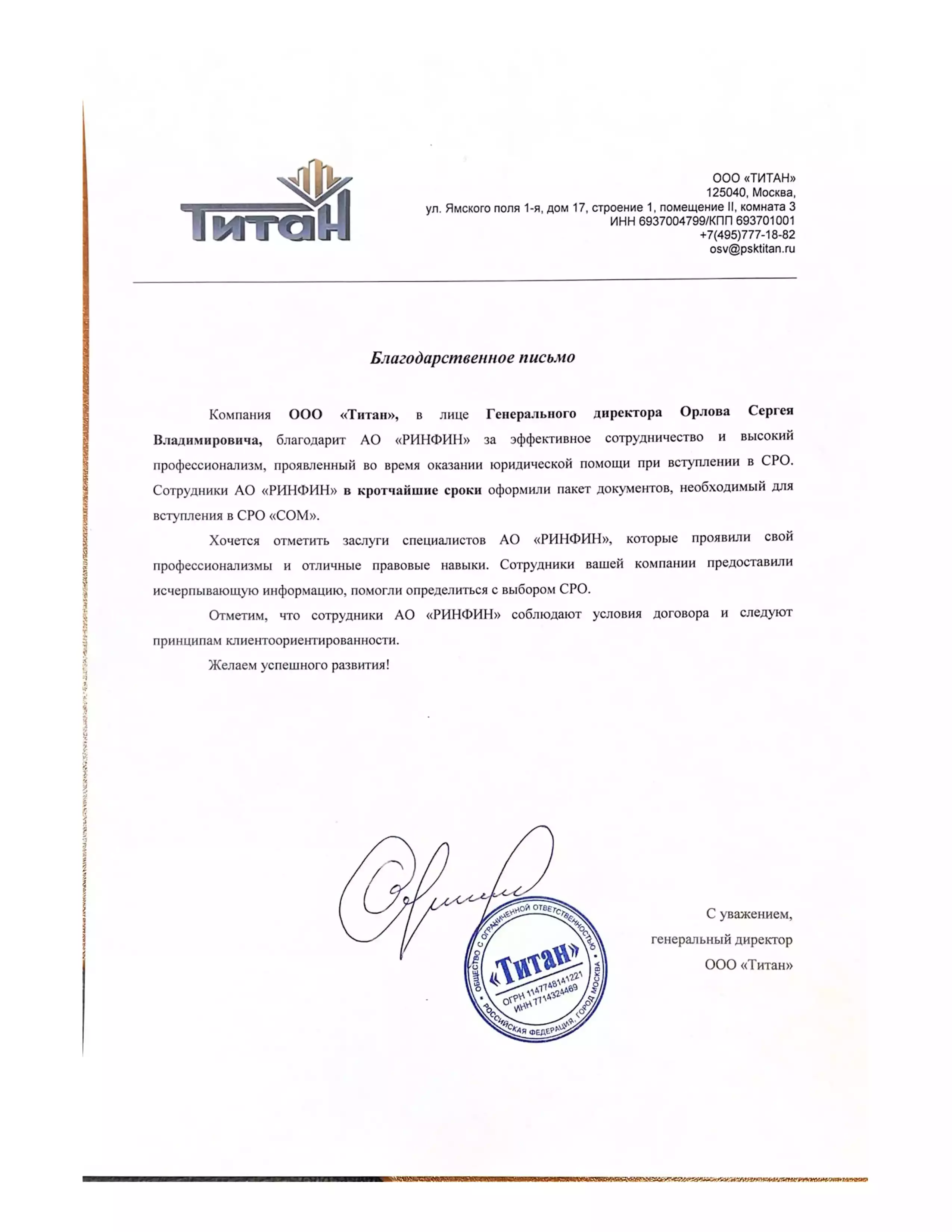 Компания ООО «Титан», в лице Генерального директора Орлова Сергея Владимировича, благодарит АО «РИНФИН» за эффективное сотрудничество и высокий профессионализм, проявленный во время оказания юридической помощи при вступлении в СРО. Сотрудники АО «РИНФИН» в кратчайшие сроки оформили пакет документов, необходимый для вступления в СРО «СОМ».