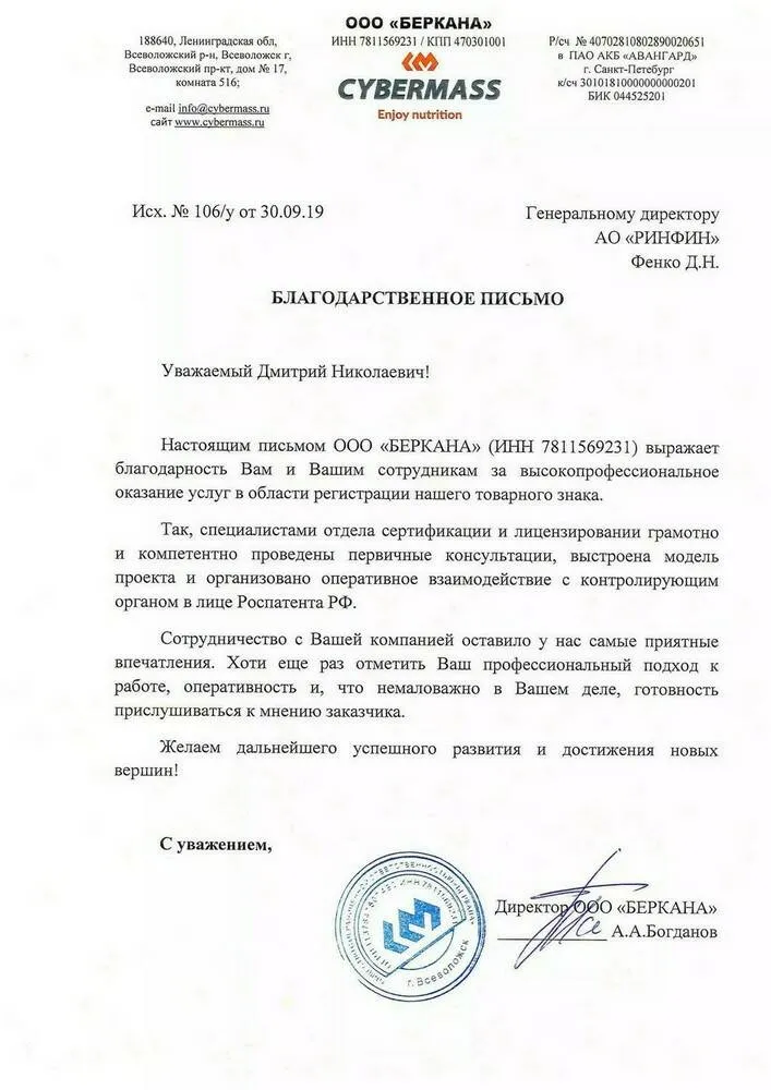 Уважаемый Дмитрий Николаевич! Настоящим письмом ООО «БЕРКАНА» (ИНН 7811569231) выражает благодарность Вам и Вашим сотрудникам за высокопрофессиональное оказание услуг в области регистрации нашего товарного знака.