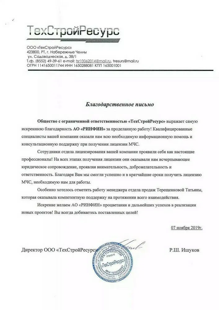 Общество с ограниченной ответственностью «ТехСтройРесурс» выражает самую искреннюю благодарность АО «РИНФИН» за проделанную работу! Квалифицированные специалисты вашей компании оказали нам всю необходимую информационную помощь и консультационную поддержку при получении лицензии МЧС.