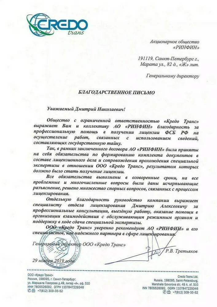 Уважаемый Дмитрий Николаевич! Общество с ограниченной ответственностью «Кредо Транс» выражает Вам и коллективу АО «РИНФИН» благодарность за профессиональную помощь в получении лицензии ФСБ РФ на осуществление работ, связанных с использованием сведений, составляющих государственную тайну.