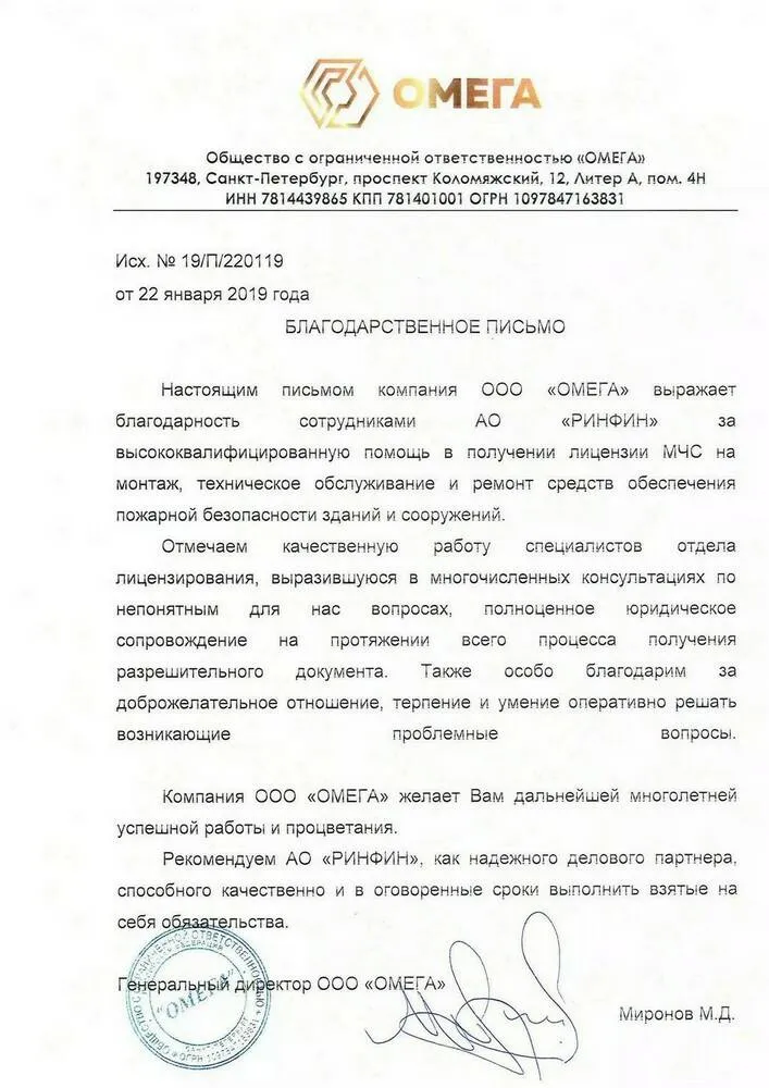 Настоящим письмом компания ООО «ОМЕГА» выражает благодарность сотрудниками АО «РИНФИН» за высококвалифицированную помощь в получении лицензии МЧС на монтаж, техническое обслуживание и ремонт средств обеспечения пожарной безопасности зданий и сооружений.