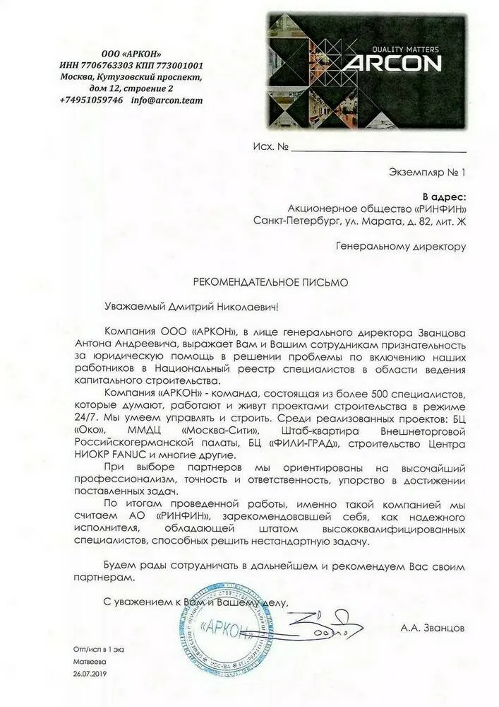 Уважаемый Дмитрий Николаевич! Компания ООО «АРКОН», в лице генерального директора Званцова Антона Андреевича, выражает Вам и Вашим сотрудникам признательность за юридическую помощь в решении проблемы по включению наших работников в Национальный реестр специалистов в области ведения капитального строительства.