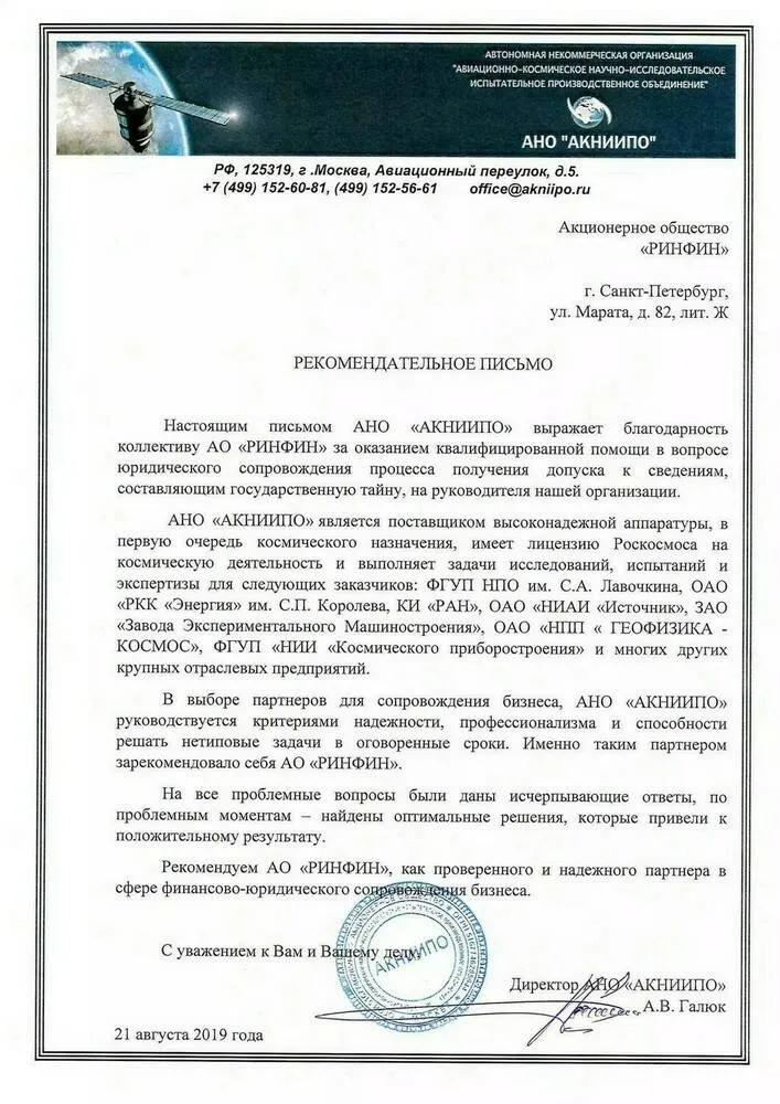 Настоящим письмом АНО «АКНИИПО» выражает благодарность коллективу АО «РИНФИН» за оказанием квалифицированной помощи в вопросе юридического сопровождения процесса получения допуска к сведениям, составляющим государственную тайну, на руководителя нашей организации.