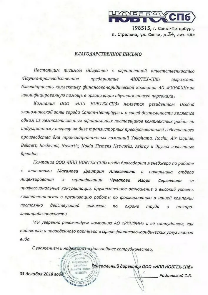 Настоящим письмом Общество с ограниченной ответственностью «Научно-производственное предприятие «НОВТЕХ-СПб» выражает благодарность коллективу финансово-юридической компании АО «РИНФИН» за квалифицированную помощь в организации обучения нашего персонала.