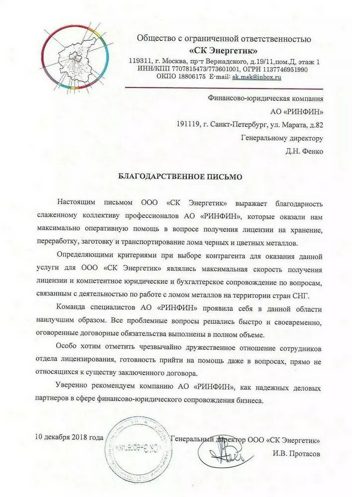 Настоящим письмом ООО «СК Энергетик» выражает благодарность слаженному коллективу профессионалов АО «РИНФИН», которые оказали нам максимально оперативную помощь в вопросе получения лицензии на хранение, переработку, заготовку и транспортирование лома черных и цветных металлов.