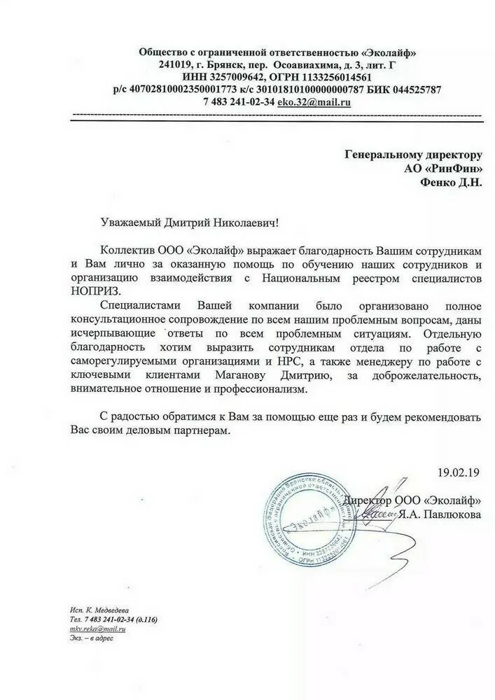 Уважаемый Дмитрий Николаевич! Коллектив ООО «Эколайф» выражает благодарность Вашим сотрудникам и Вам лично за оказанную помощь по обучению наших сотрудников и организацию взаимодействия с Национальным реестром специалистов НОПРИЗ.