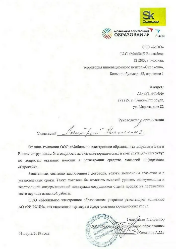 Уважаемый Дмитрий Николаевич! От лица компании ООО «Мобильное электронное образование» выражаем Вам и Вашим сотрудникам благодарность за оказание юридических и консультационных услуг по вопросам оказания помощи в регистрации средства массовой информации «Строка24».