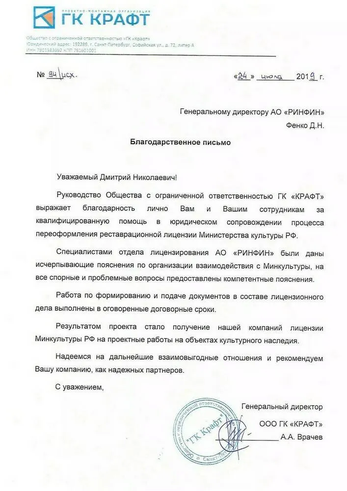 Уважаемый Дмитрий Николаевич! Руководство Общества с ограниченной ответственностью ГК «КРАФТ» выражает благодарность лично Вам и Вашим сотрудникам за квалифицированную помощь в юридическом сопровождении процесса переоформления реставрационной лицензии Министерства культуры РФ.