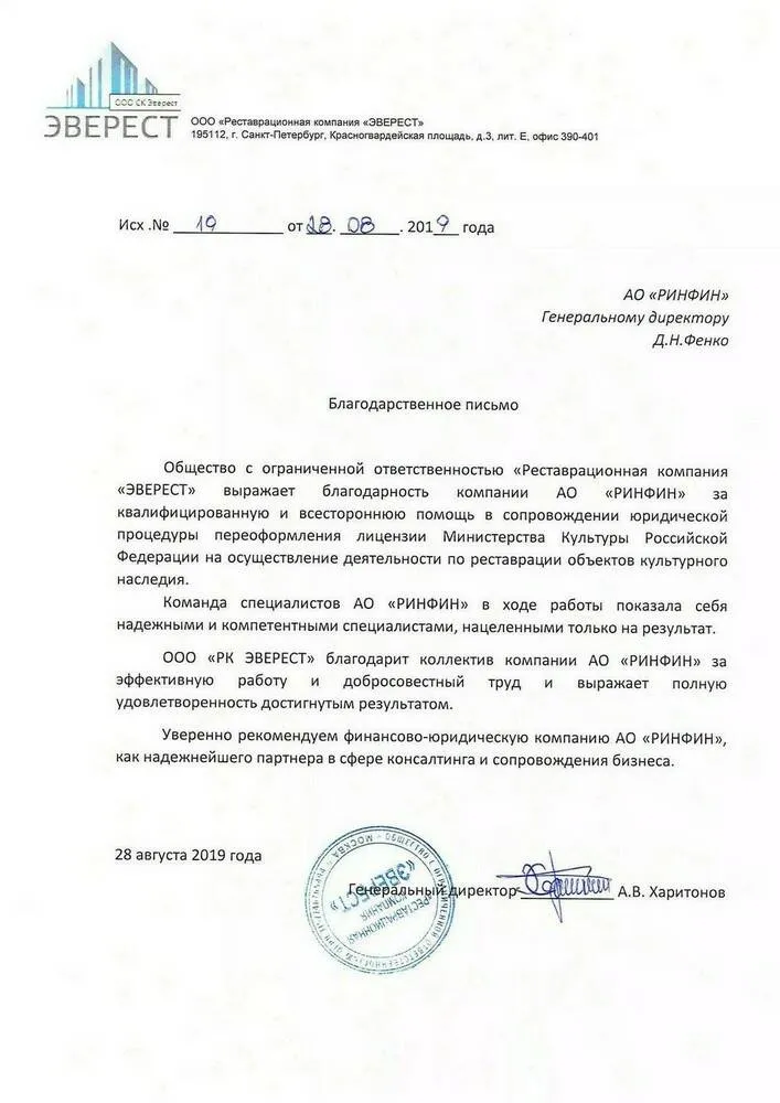 Общество с ограниченной ответственностью «Реставрационная компания «ЭВЕРЕСТ» выражает благодарность компании АО «РИНФИН» за квалифицированную и всестороннюю помощь в сопровождении юридической процедуры переоформления лицензии Министерства Культуры Российской Федерации на осуществление деятельности по реставрации объектов культурного наследия.