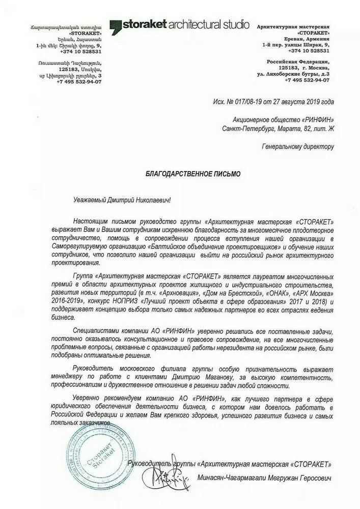 Уважаемый Дмитрий Николаевич! Настоящим письмом руководство группы «Архитектурная мастерская «СТОРАКЕТ» выражает Вам и Вашим сотрудникам искреннюю благодарность за многомесячное плодотворное сотрудничество, помощь в сопровождении процесса вступления нашей организации в Саморегулируемую организацию «Балтийское объединение проектировщиков» и обучение наших сотрудников, что позволило нашей организации выйти на российский рынок архитектурного проектирования.