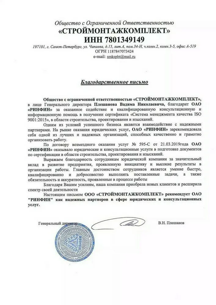 Настоящим письмом ООО «СТРОЙМОНТАЖКОМПЛЕКТ» рекомендует АО «РИНФИН» как надежных партнеров в сфере юридических и консультационных услуг.
