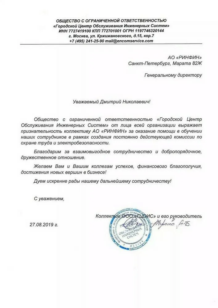 Уважаемый Дмитрий Николаевич! Общество с ограниченной ответственностью «Городской Центр Обслуживания Инженерных Систем» от лица всей организации выражает признательность коллективу АО «РИНФИН» за оказание помощи в обучении наших сотрудников в рамках создания постоянно действующей комиссии по охране труда и электробезопасности.