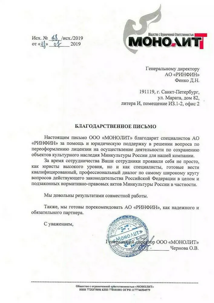 Настоящим письмом ООО «МОНОЛИТ» благодарит специалистов АО «РИНФИН» за помощь и юридическую поддержку в решении вопроса по переоформлению лицензии на осуществление деятельности по сохранению объектов культурного наследия Минкультуры России для нашей компании.