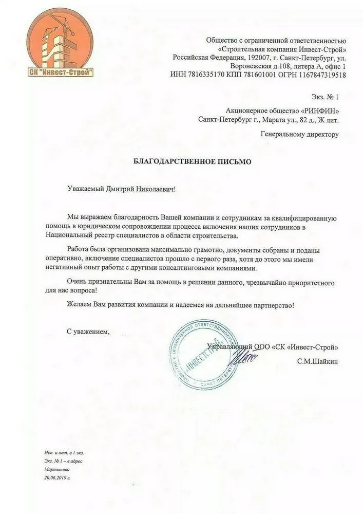 Уважаемый Дмитрий Николаевич! Мы выражаем благодарность Вашей компании и сотрудникам за квалифицированную помощь в юридическом сопровождении процесса включения наших сотрудников в Национальный реестр специалистов в области строительства.