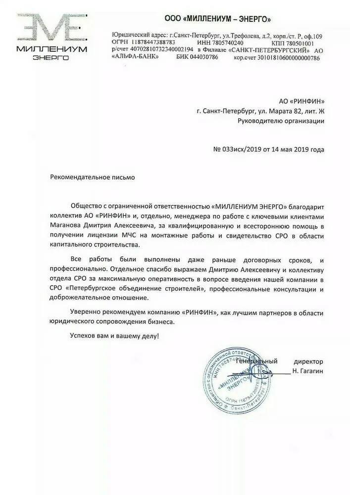 Надеемся на продолжение сложившихся деловых отношений и рекомендуем юридическую компанию АО «РИНФИН» как надежного партнера на рынке юридических и консультационных услуг.