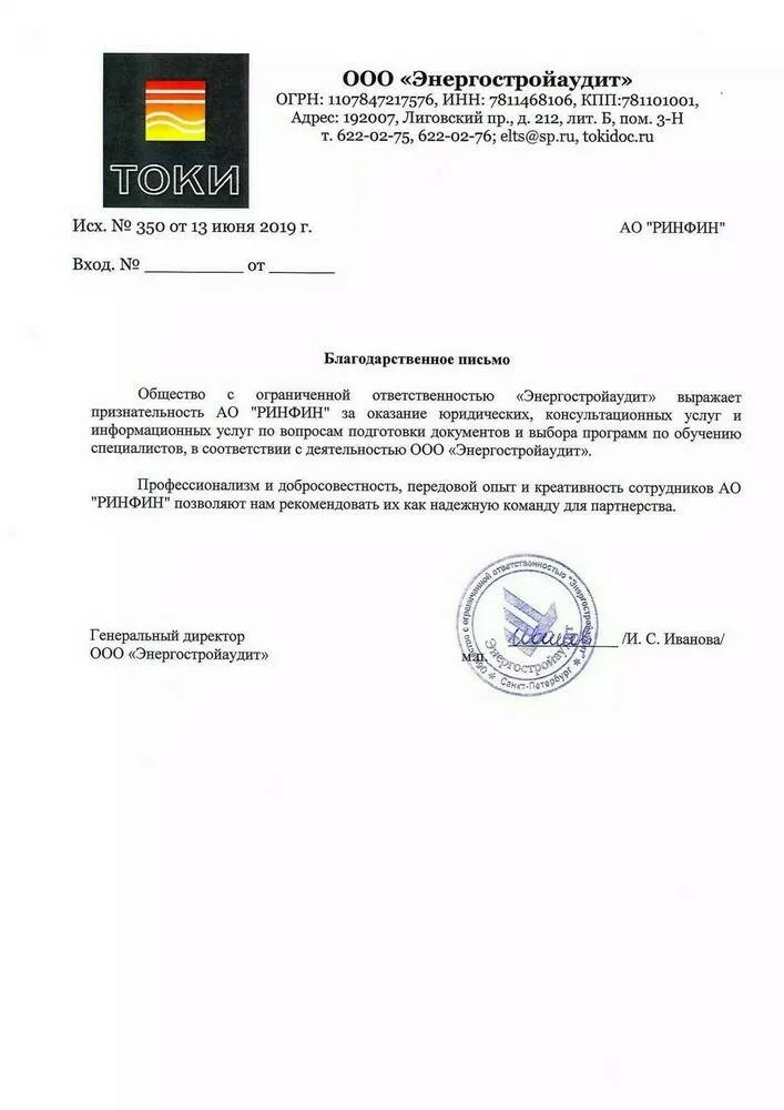 Общество с ограниченной ответственностью «Энергостройаудит» выражает признательность АО «РИНФИН» за оказание юридических, консультационных услуг и информационных услуг по вопросам подготовки документов и выбора программ по обучению специалистов, в соответствии с деятельностью ООО «Энергостройаудит».