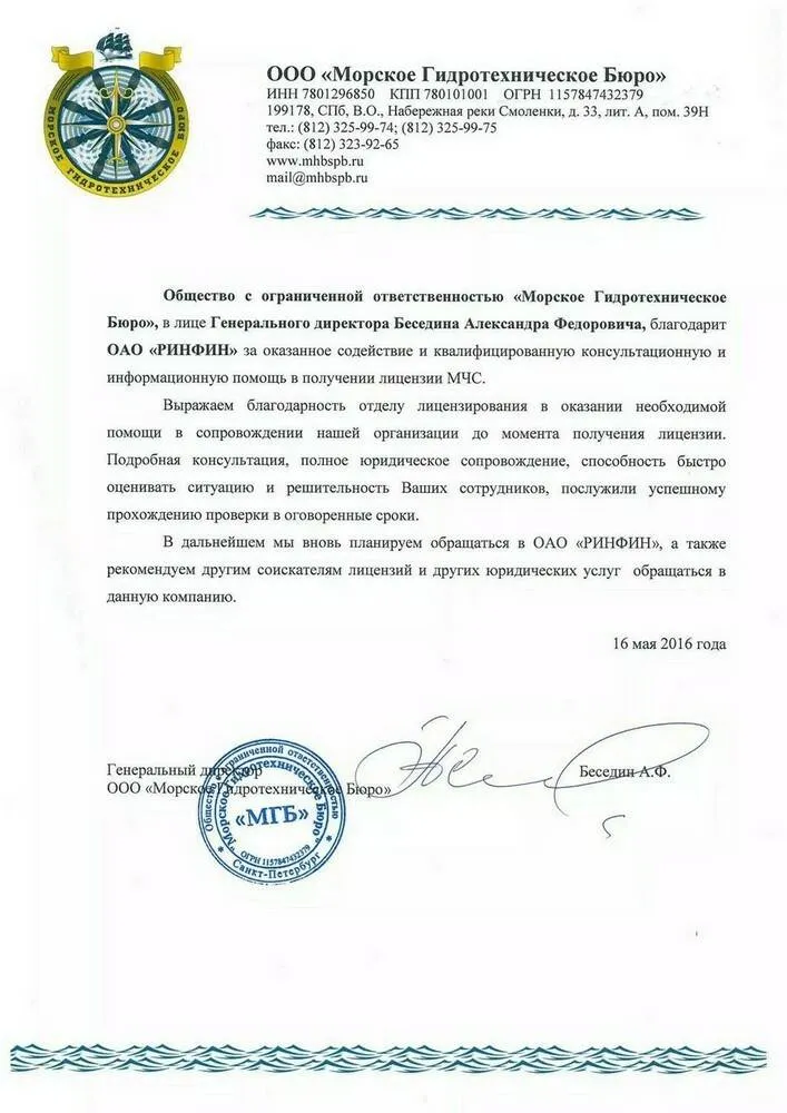 Общество с ограниченной ответственностью «Морское Гидротехническое Бюро», в лице Генерального директора Беседина Александра Федоровича, благодарит АО «РИНФИН» за оказанное содействие и квалифицированную консультационную и информационную помощь в получении лицензии МЧС.