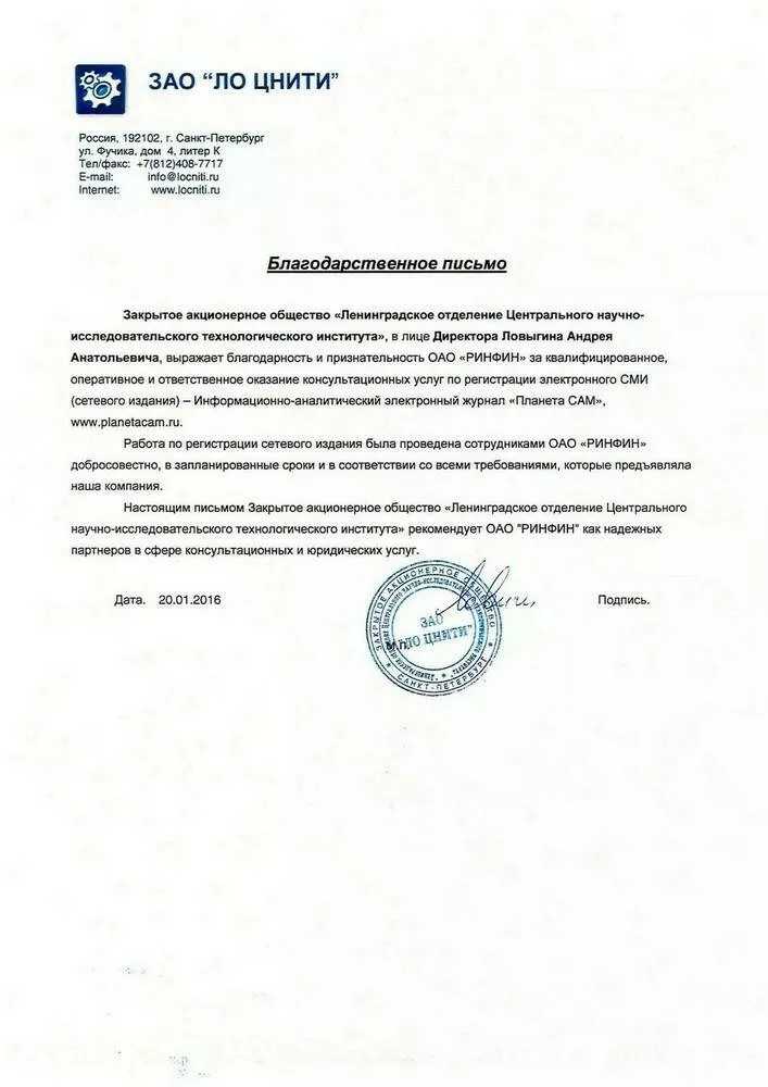 Закрытое акционерное общество «Ленинградское отделение Центрального научно-исследовательского технологического института», в лице Директора Ловыгина Андрея Анатольевича, выражает благодарность и признательность АО «РИНФИН» за квалифицированное, оперативное и ответственное оказание консультационных услуг по регистрации электронного СМИ (сетевого издания) — Информационно-аналитический электронный журнал «Планета САМ», www.planetacam.ru