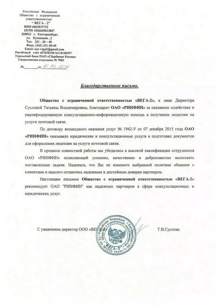 Общество с ограниченной ответственностью «ВЕГА-2», в лице Директора Сусловой Татьяны Владимировны, благодарит ОАО «РИНФИНУ за оказанное содействие и квалифицированную консультационно-информационную помощь в получении лицензии на услуги почтовой связи.