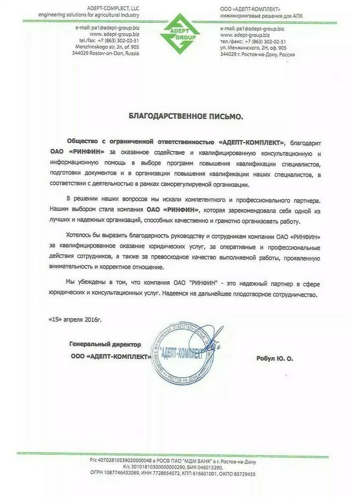 Общество с ограниченной ответственностью «АДЕПТ-КОМПЛЕКТ», благодарит АО «РИНФИН» за оказанное содействие и квалифицированную консультационную и информационную помощь в выборе программ повышения квалификации специалистов, подготовки документов и в организации повышения квалификации наших специалистов, в соответствии с деятельностью в рамках саморегулируемой организации.