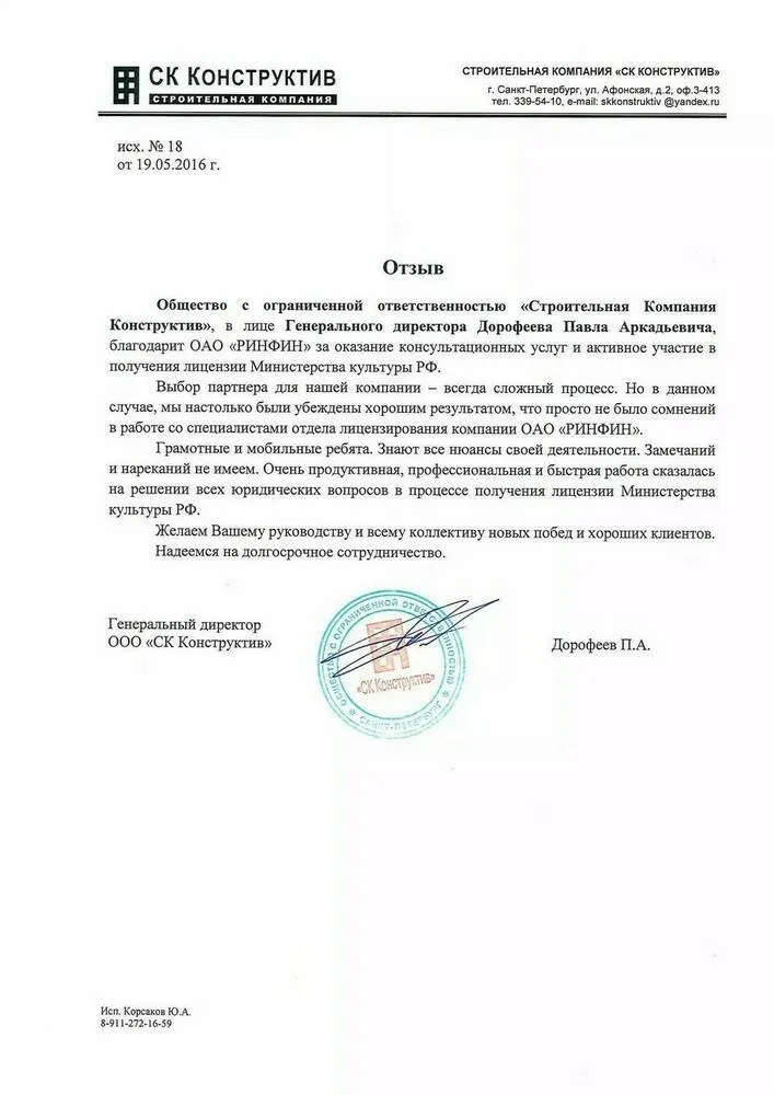 Общество с ограниченной ответственностью «Строительная Компания Конструктив», в лице Генерального директора Дорофеева Павла Аркадьевича, благодарит АО «РИНФИН» за оказание консультационных услуг и активное участие в получении лицензии Министерства культуры РФ.