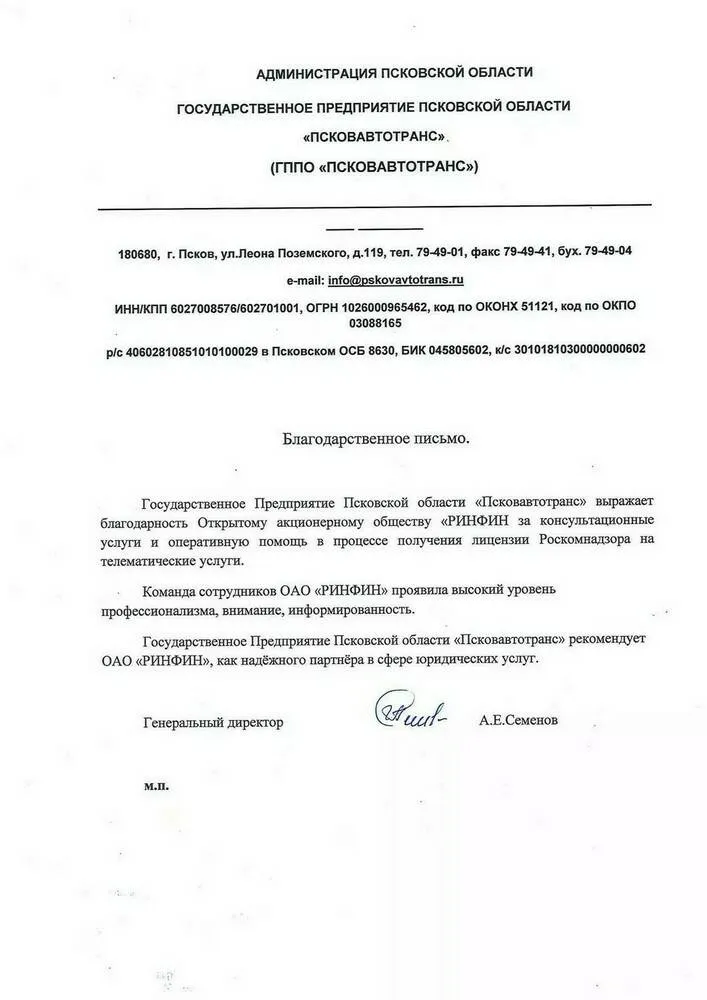 Государственное Предприятие Псковской области «Псковавтотранс» выражает благодарность Открытому акционерному обществу «РИНФИН» за консультационные услуги и оперативную помощь в процессе получения лицензии Роскомнадзора на телематические услуги.