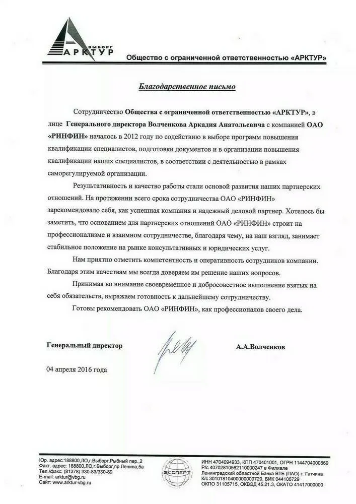 Сотрудничество Общества с ограниченной ответственностью «АРКТУР», в лице Генерального директора Волченкова Аркадия Анатольевича с компанией АО «РИНФИН» началось в 2012 году по содействию в выборе программ повышения квалификации специалистов, подготовки документов и в организации повышения квалификации наших специалистов, в соответствии с деятельностью в рамках саморегулируемой организации.