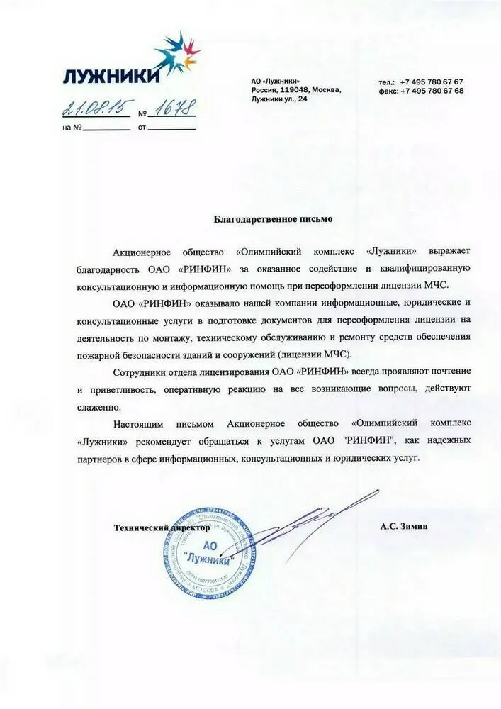 Акционерное общество «Олимпийский комплекс «Лужники» выражает благодарность АО «РИНФИН» за оказанное содействие и квалифицированную консультационную и информационную помощь при переоформлении лицензии МЧС.