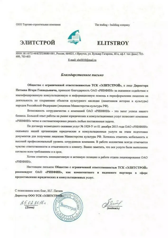 Общество с ограниченной ответственностью ТСК «ЭЛИТСТРОЙ», в лице Директора Пятаева Игоря Геннадьевича, приносит благодарность АО «РИНФИН» за оказанное содействие и квалифицированную консультационную и информационную помощь в переоформлении лицензии на деятельность по сохранению объектов культурного наследия (памятников истории и культуры) народов Российской Федерации (лицензии Министерства культуры РФ).