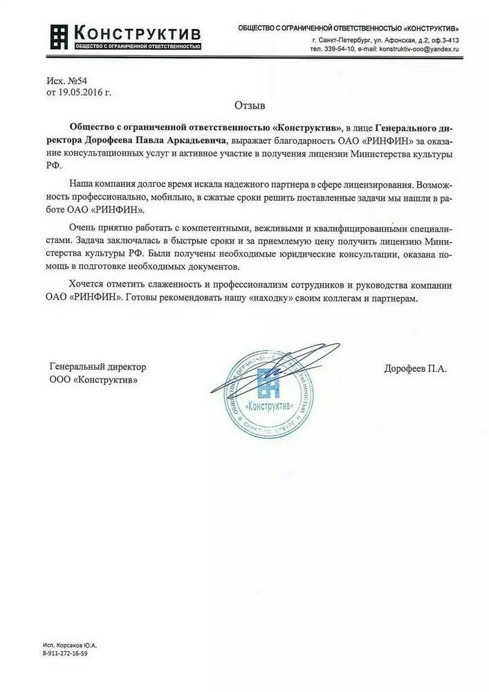 Общество с ограниченной ответственностью «Конструктив», в лице Генерального директора Дорофеева Павла Аркадьевича, выражает благодарность АО «РИНФИН» за оказание консультационных услуг и активное участие в получении лицензии Министерства культуры РФ.