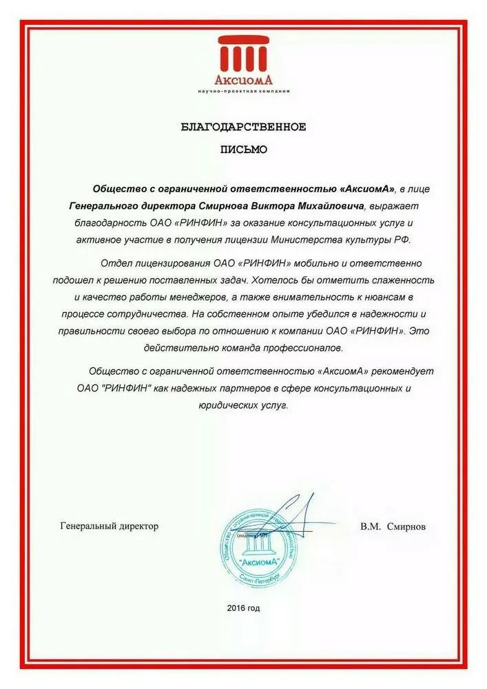 Общество с ограниченной ответственностью «АксиомА», в лице Генерального директора Смирнова Виктора Михайловича, выражает благодарность АО «РИНФИН» за оказание консультационных услуг u активное участие в получении лицензии Министерства культуры РФ.
